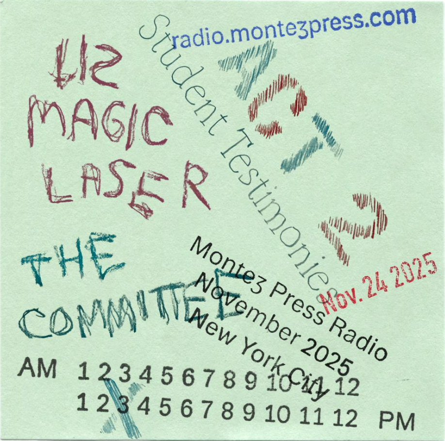 The Committee is a radio play by Liz Magic Lazer that weaves student testimonies into a collective autofiction — part psychodrama, part political satire. Presented as a live news broadcast, it draws on the rhetoric of McCarthyism, the spectacle of reality TV, and the fragility of artistic freedom in a time of protest and repression.